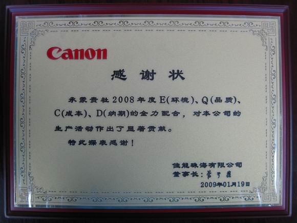 利達(dá)光電榮獲佳能珠海2008年度最佳供應(yīng)商稱號