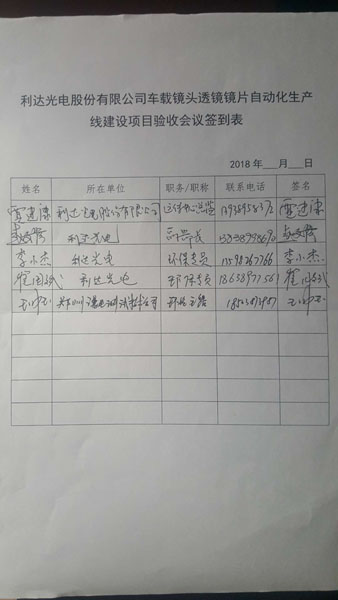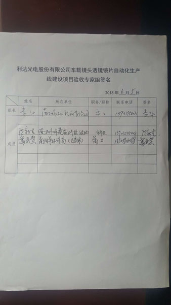 | ???? 2018 年 6 月 5 日,利達光電股份有限公司根據利達光電股份有限公司車載鏡頭透鏡鏡片自動化生產線建設項目竣工環(huán)境保護驗收監(jiān)測報告,并按照《建設項目竣工環(huán)境保護驗收暫行辦法》,嚴格按照國家有關法律法規(guī)、建設項目竣工環(huán)境保護驗收技術規(guī)范/指南、本項目環(huán)境影響評價報告表和審批部門審批意見等要求,主持召開了該公司車載鏡頭透鏡鏡片自動化生產線建設項目環(huán)境保護竣工驗收會議。參加驗收會議的有項目建設單位(利達光電股份有限公司)、環(huán)評單位(南陽市環(huán)境保護科學研究所有限公司)、驗收監(jiān)測報告編制單位(鄭州譜尼測試技術有限公司)的領導、代表及邀請的專家共計 6 人,會議成立了項目竣工環(huán)境保護驗收組(名單附后),負責項目的驗收工作。 |